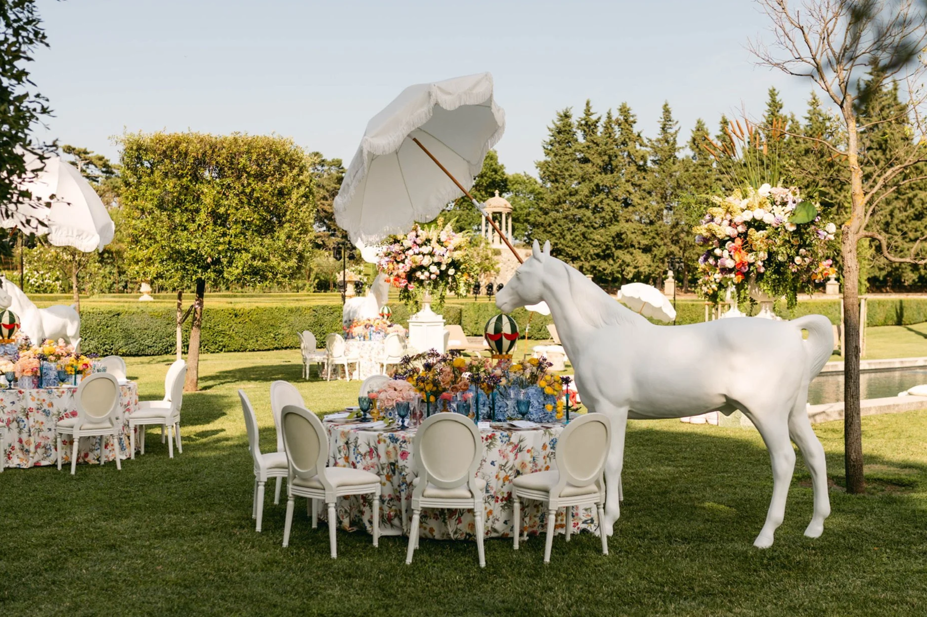 The property was reconfigured overnight between events, creating a different setting each evening. The programme included Michelin-starred cuisine, international artists, live musicians, and large-scale production elements sourced globally.